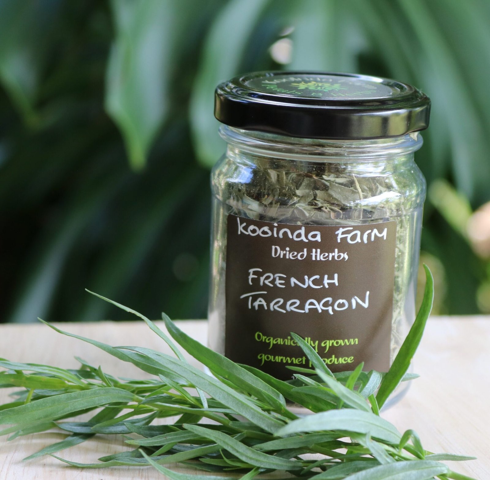 Freshly harvested French Tarragon from Kooinda Farms organically grown, Prize Winning Herbs! Dehydrated using solar power to crisp perfection, prime hand picked leaf only – no stalks.